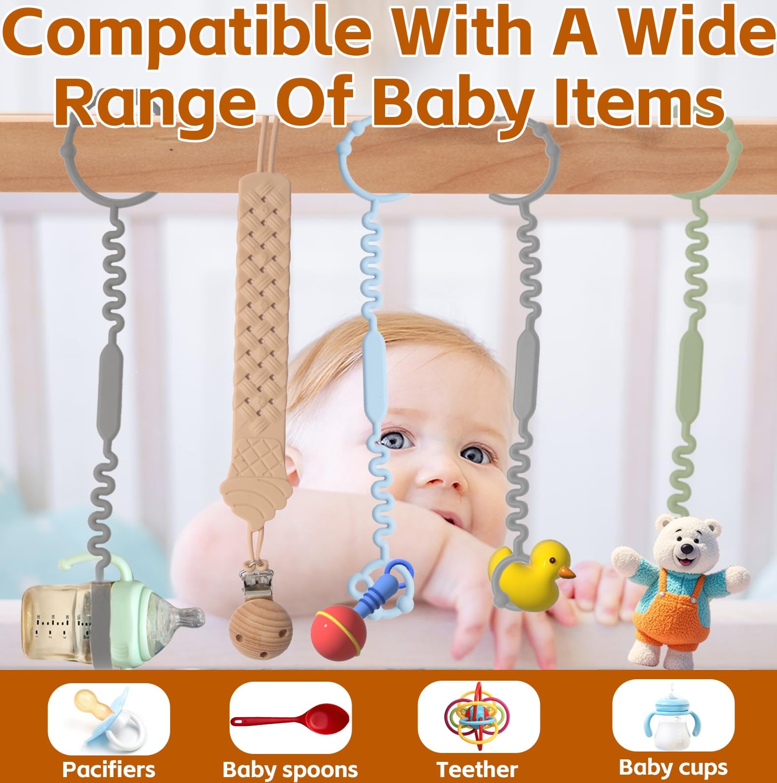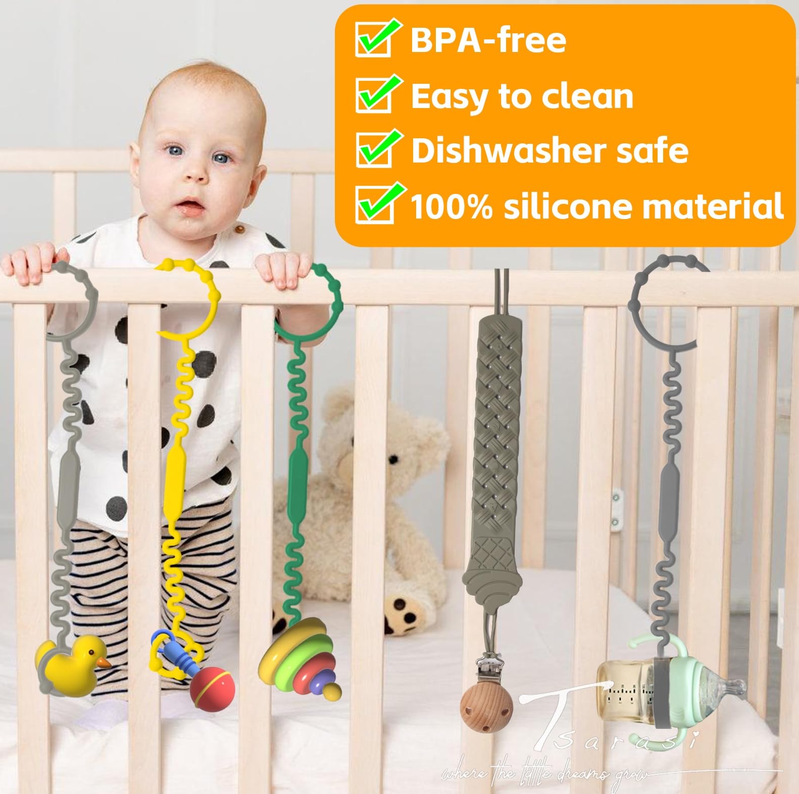 Tsarasi Silicone Baby Toy & Bottle Strap Set – Includes 1 Universal Bottle Strap, 3 Adjustable Toy Straps, &1 Pacifier Clip (Baby Blue+Celadon+Blue Gray+Gray Bottle Strap+Tan Pacifier Chain)